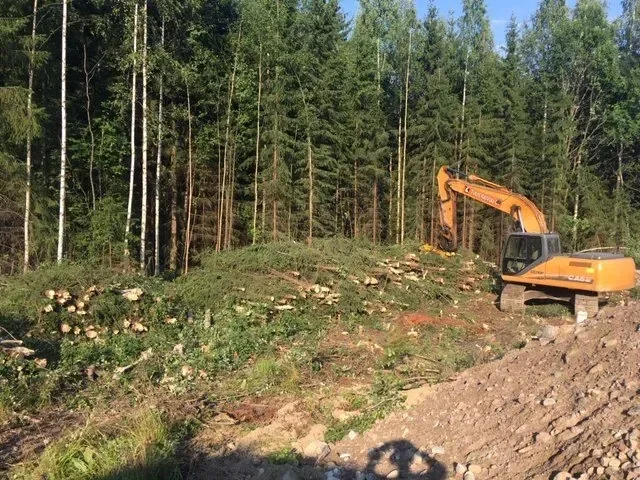 Tontin koneellinen raivaus: Raivaamme tehokkaasti isommatkin alueet rakennusvalmiiksi nykyaikaisella kalustollamme.